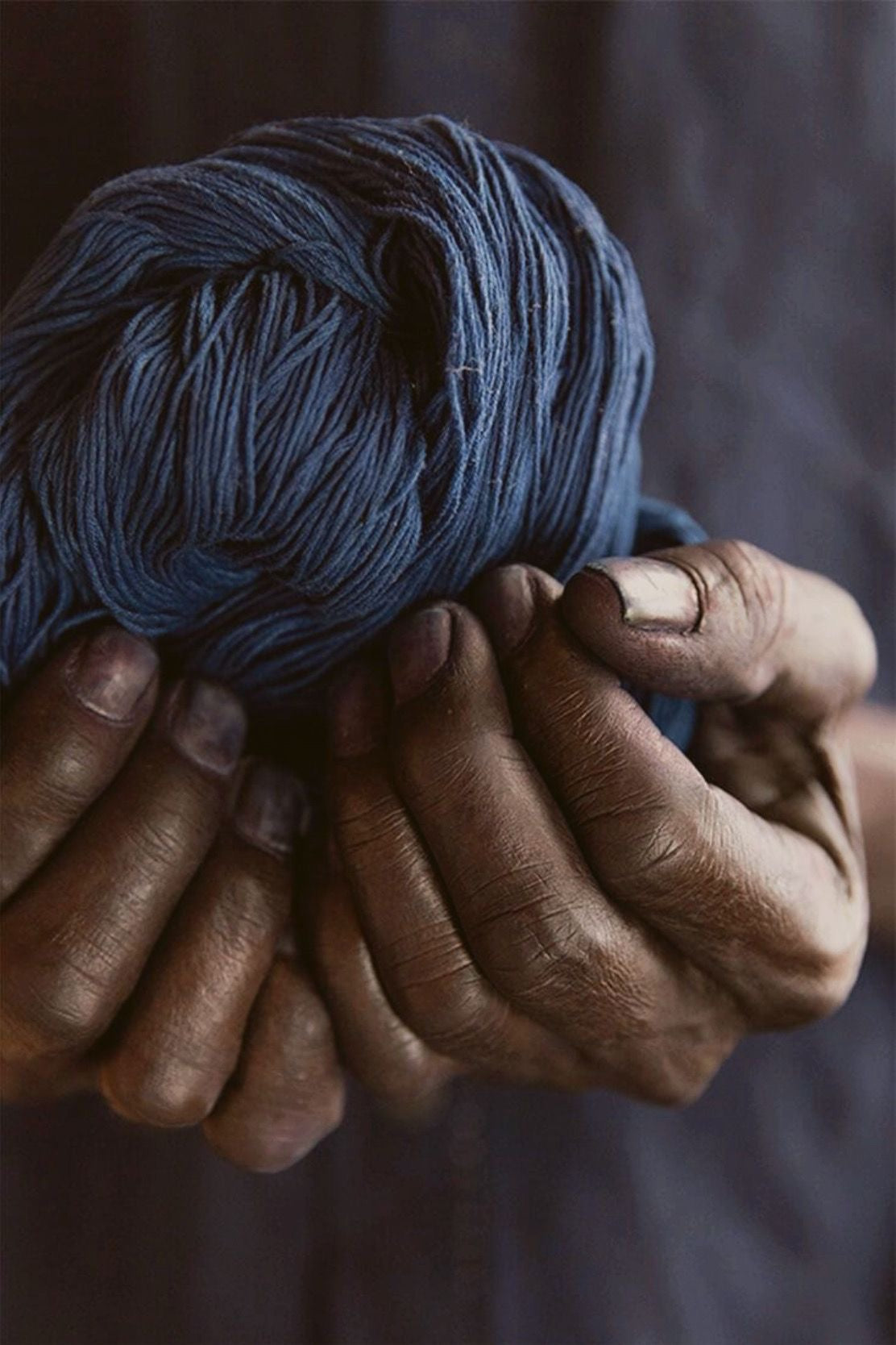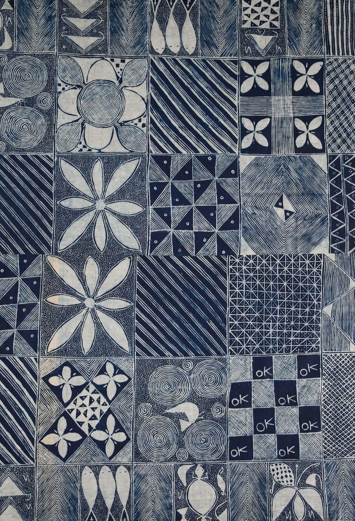 In the oldest forms of adire, two basic resist techniques are used to create soft blue or white designs to contrast with a deeply saturated indigo-blue background