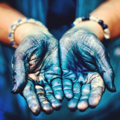 Adire was dyed indigo (dark blue) and it is still the most popular color. Indigo dye is made from elu leaves or elu grains. The leaves are grounded with water and soda ash cooked together. Soaked for days to create the color. Resist-dyeing which involves creating a pattern by treating certain parts of the fabric in some way to prevent them absorbing dye.
