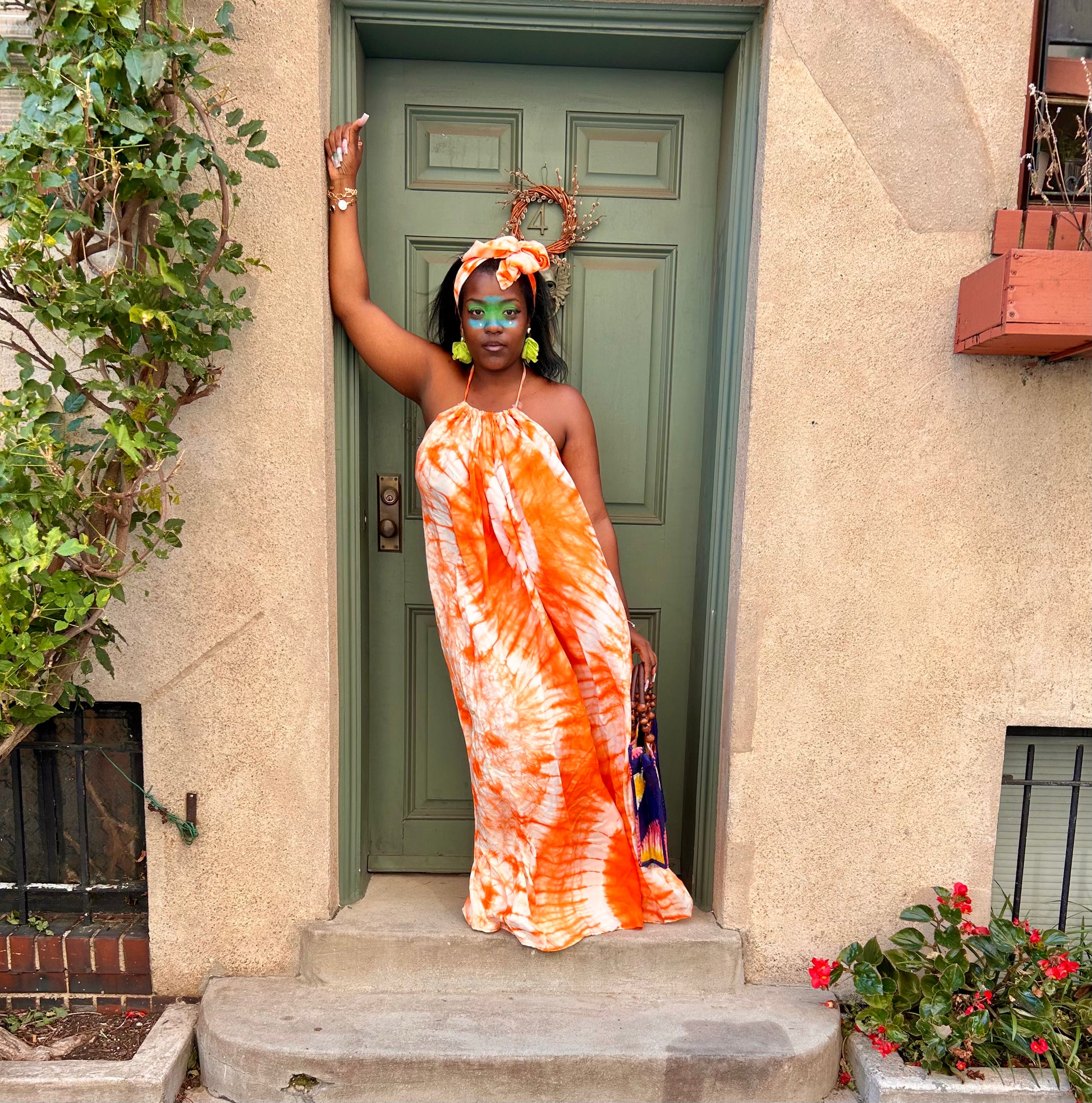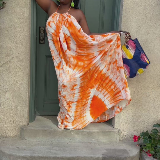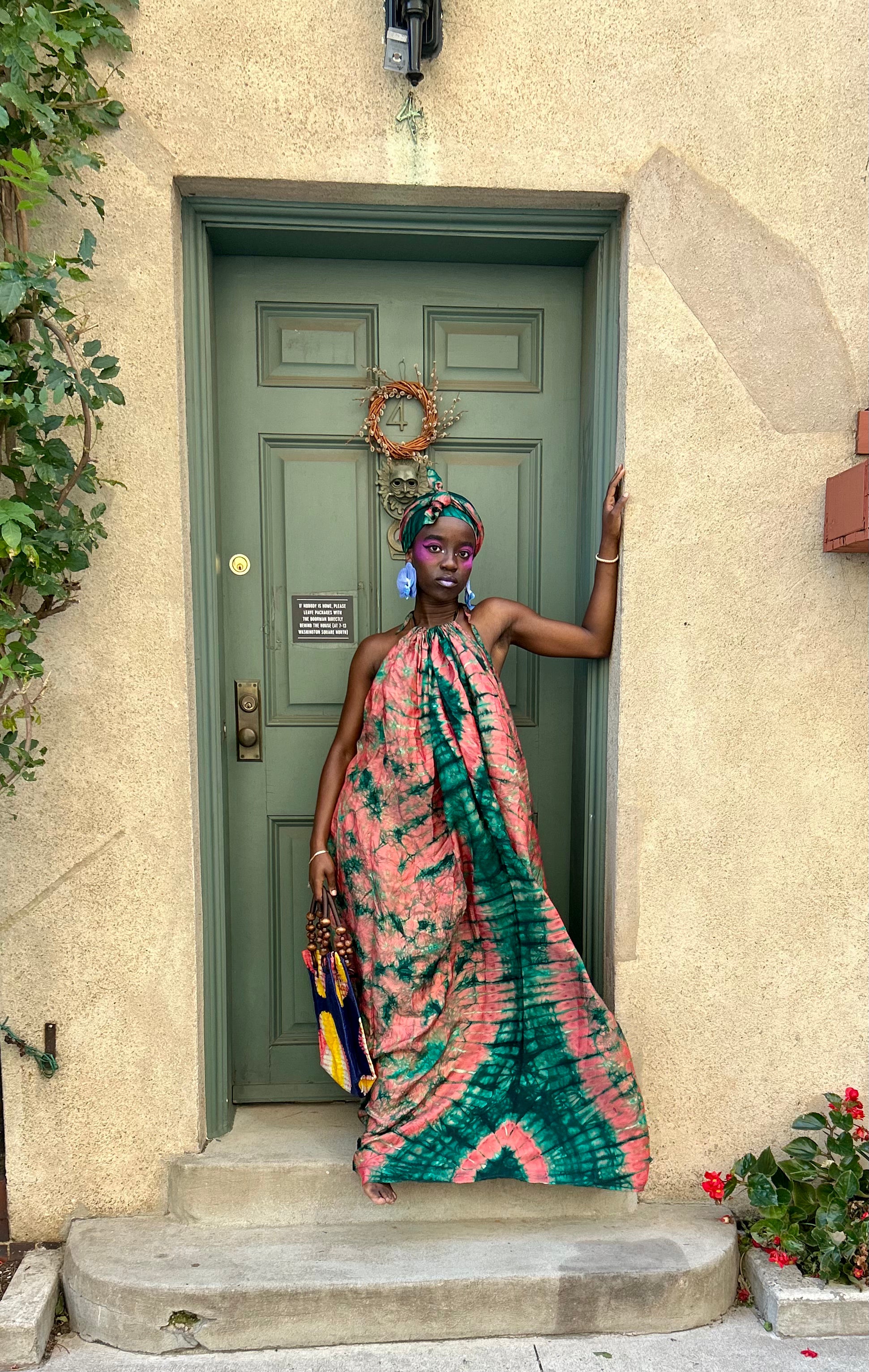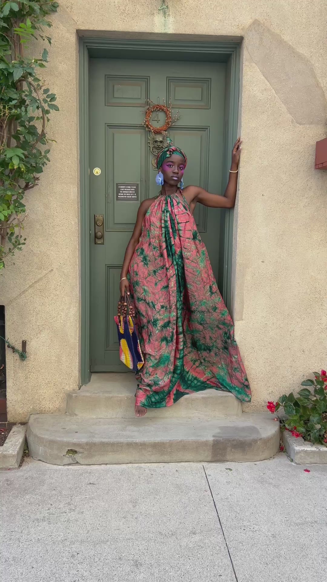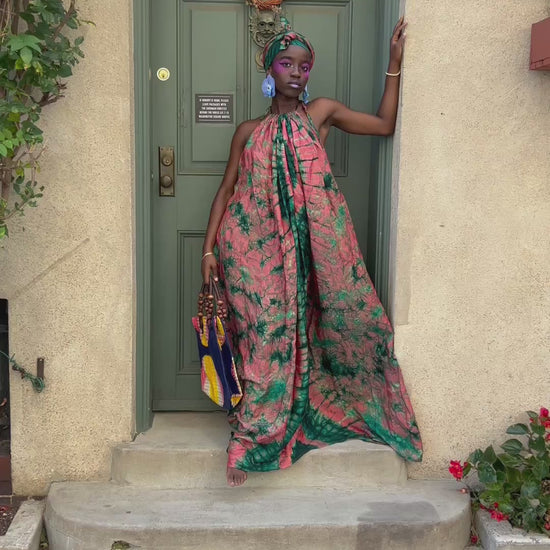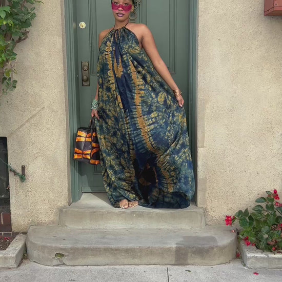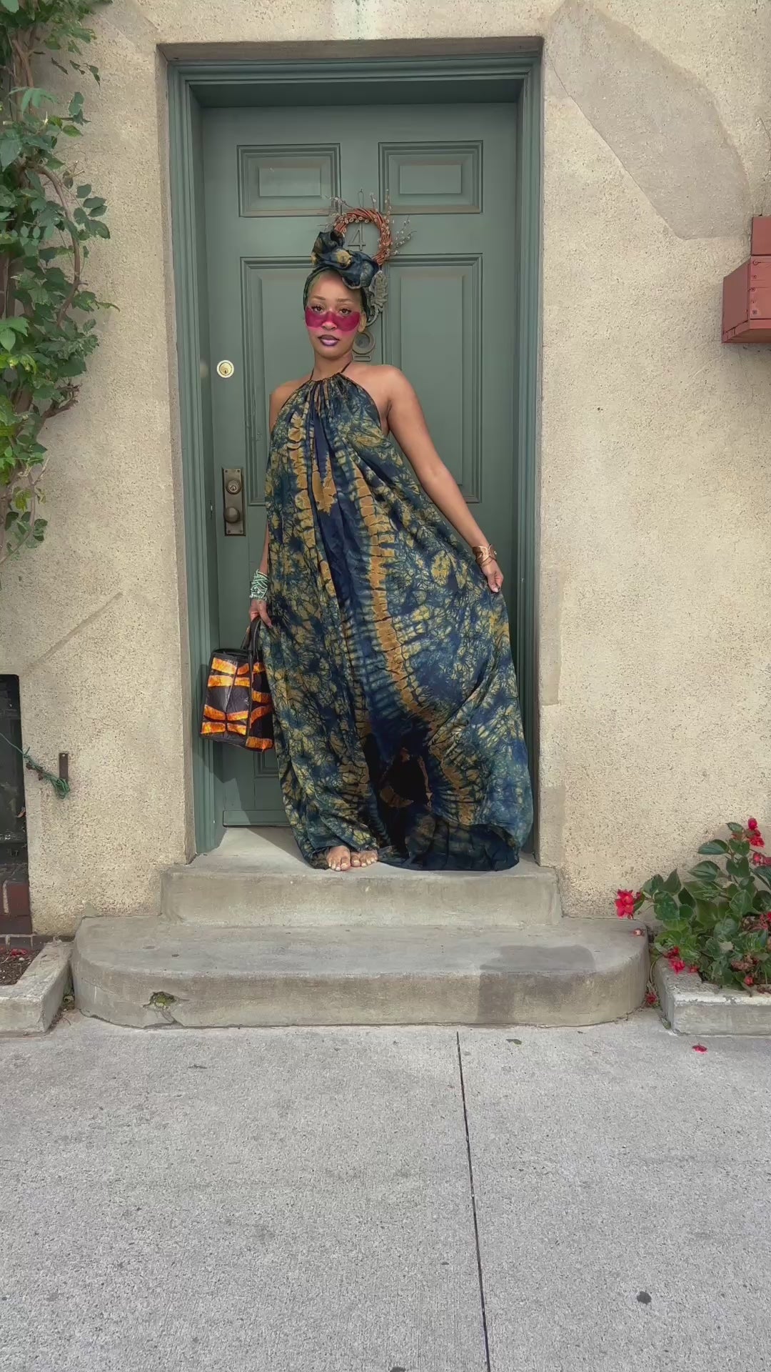 Hand-dyed in Adire silk, the Yomola dress drapes with an effortless goddess energy. Its open-back silhouette moves between seasons and moments. From summer holidays to fall evenings, from weddings to everyday rituals of beauty. Designed for the women who carries both softness and power. Each piece is one-of-a-kind and available in limited quantities.